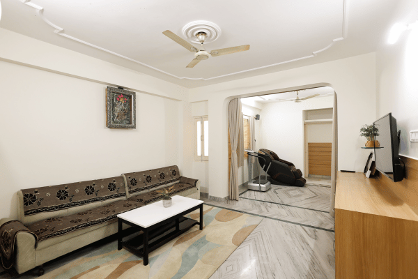 The two spacious bedrooms come with attached bathrooms, complete with all the essential toiletries and a geyser for hot water. The bedrooms are tastefully furnished with comfortable beds and ample storage space, providing a peaceful retreat after a long day.